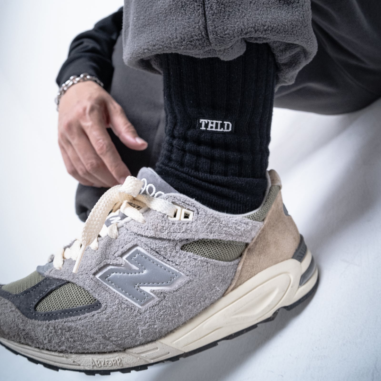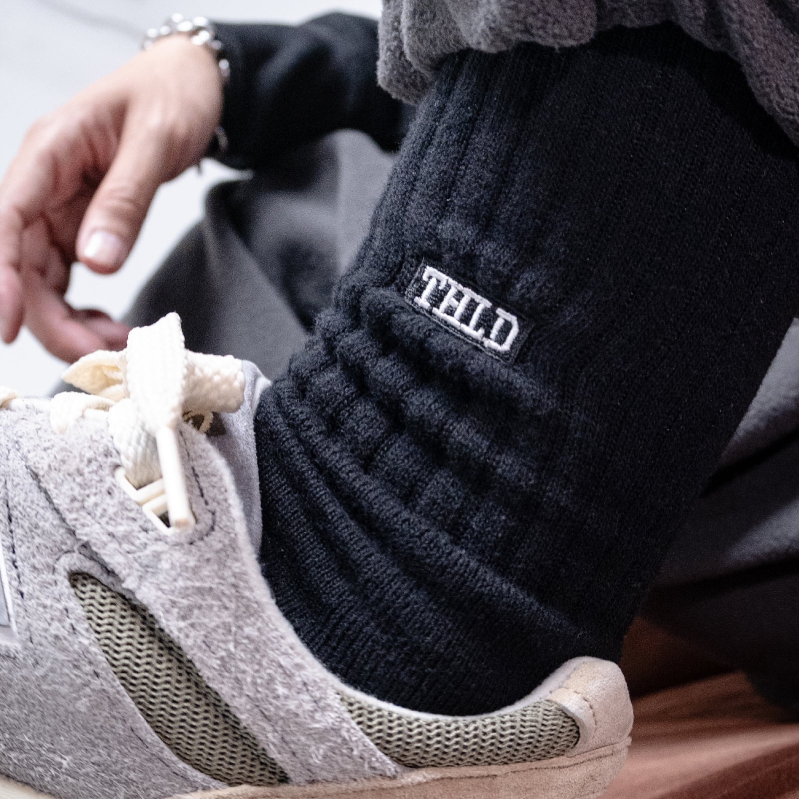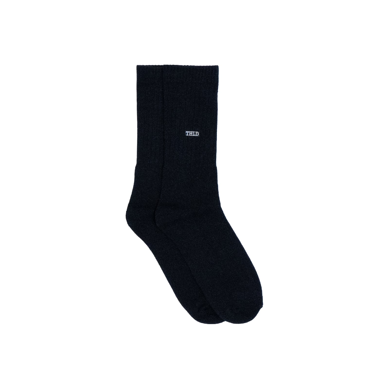 ローカットスニーカーとのバランスを意識しアンクル位置に「THLD」ロゴを刺繍で配置しました。肉厚なクルーソックスはデイリーユースにも最適です。